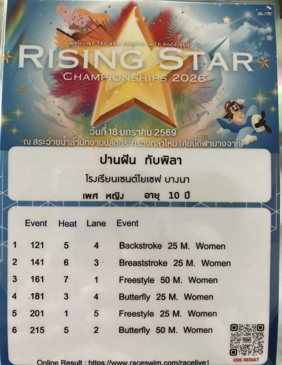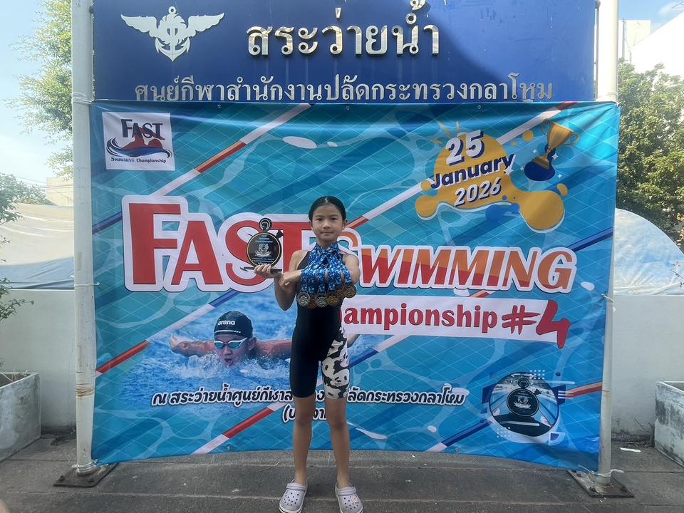 ขอเเสดงความยินดีกับเด็กหญิงปานฝัน ทับพิลา ระดับชั้นประถมศึกษาปีที่ 4/4 ได้เข้าร่วม การแข่งขันว่ายน้ำ BLITZ RISING STAR 2026 เพื่อเฉลิมฉลอง “วันเด็กแห่งชาติ” ประเภทเด็กหญิง รุ่นอายุ 10 ขวบ วันอาทิตย์ที่ 18 มกราคม 2569 ณ ศูนย์กีฬาบางจาก ได้รับรางวัล 🥇1 เหรียญทอง ว่ายผลัด 50 เมตร 🥈1 เหรียญเงิน ว่ายท่าผีเสื้อ 25 เมตร 🥉1 ทองแดง ว่ายท่าฟรีสไตล์ 25 เมตร