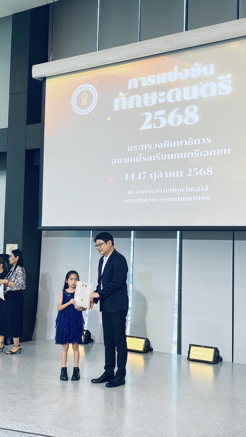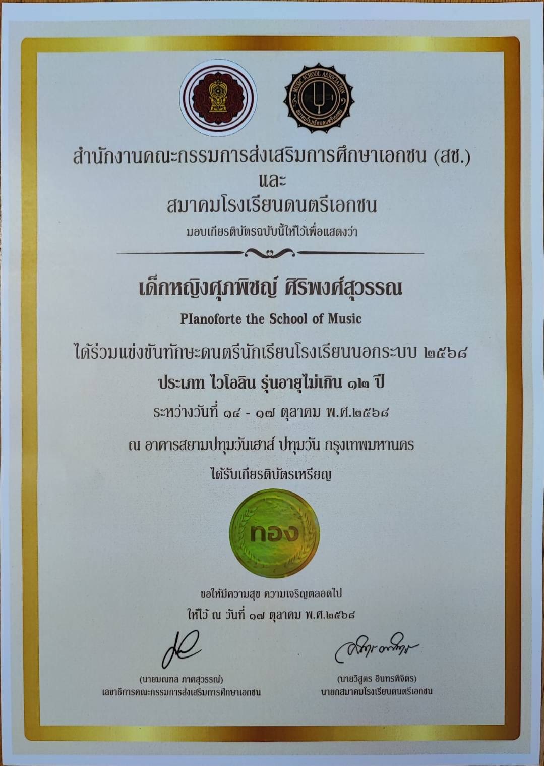 🎊 ด.ญ.ศุภพิชญ์ ศิริพงศ์สุวรรณ ระดับชั้นประถมศึกษาปีที่ 3/2 เข้าร่วมการแข่งขันทักษะดนตรีนักเรียนโรงเรียนนอกระบบ 2568 ประเภทไวโอลิน รุ่นอายุไม่เกิน 12 ปี จัดโดยสำนักงานคณะกรรมการส่งเสริมการศึกษาเอกชน(สช.) และสมาคมโรงเรียนดนตรีเอกชนระหว่างวันที่ 14-17 ตุลาคม 2568 ได้รับรางวัลเกียรติบัตรเหรียญทอง